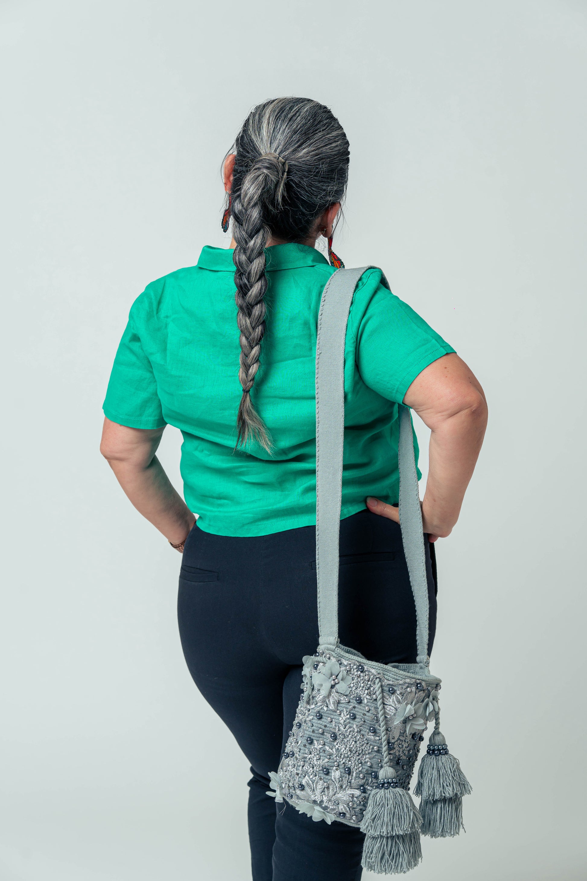 Explore the sophisticated Wayuu bag, entirely coated in an elegant silver tone and adorned with pearl and flower details. With approximate dimensions of 9.06 inches in height and 9.84 inches in width, this piece offers a perfect balance of style and functionality to carry your belongings with elegance.
