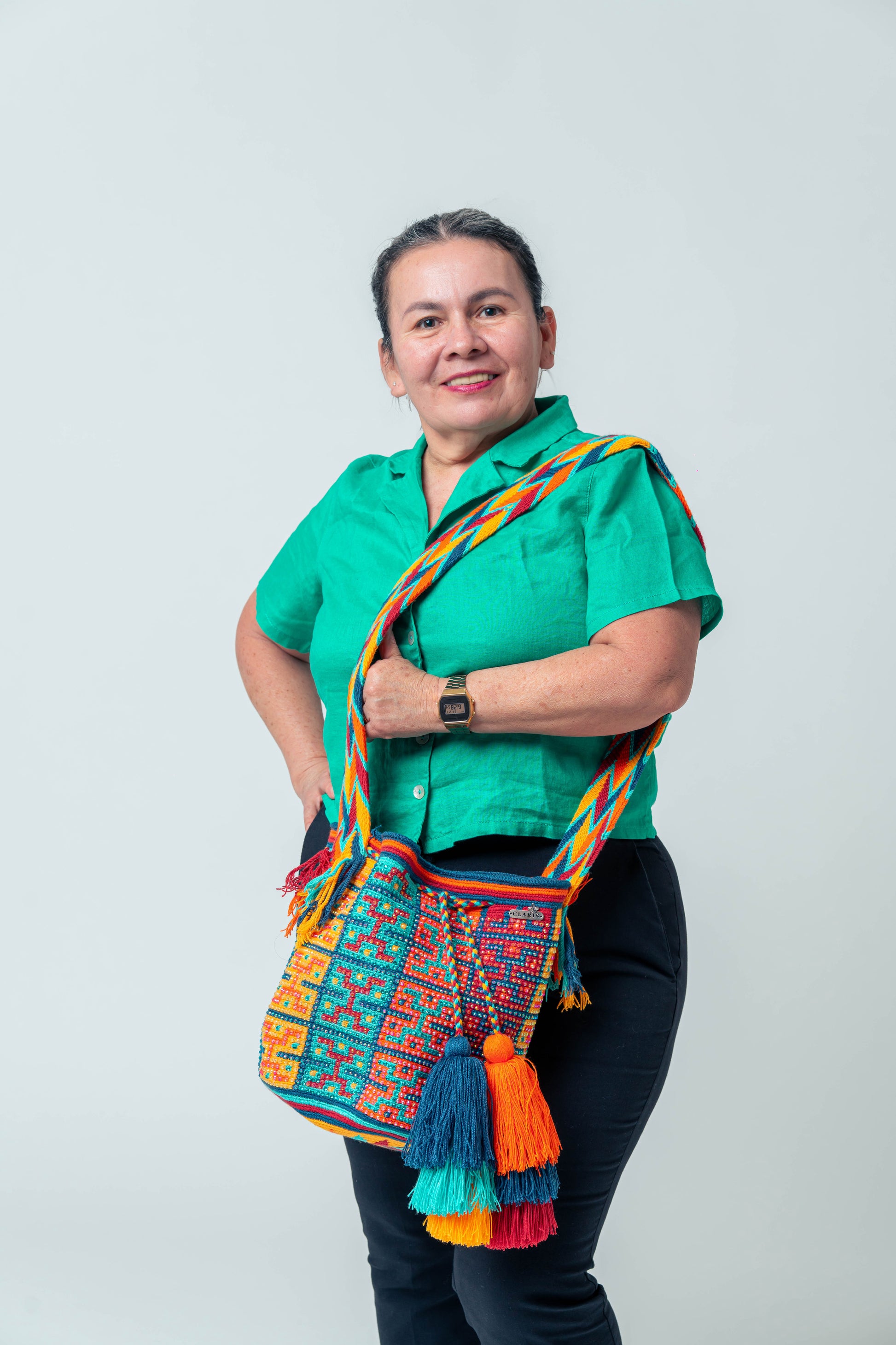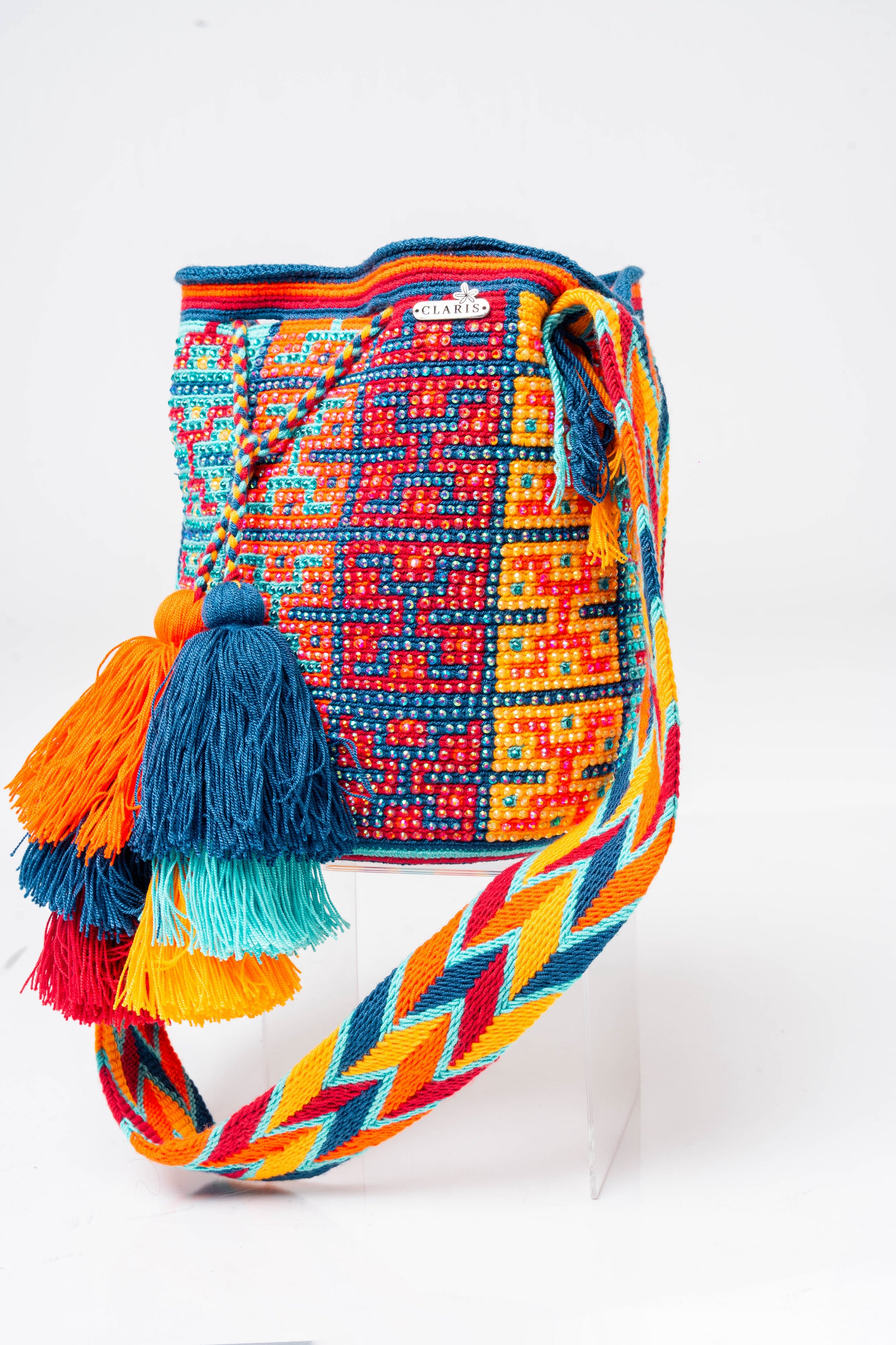 A refined Wayuu bag with a vibrant design in shades of orange, blue, mint green, yellow, and red, meticulously decorated with stones. Completing its elegance are two three-layered pompons each. Its dimensions offer a height ranging between 10 and 11 inches, and a width ranging between 11.8 and 13.3 inches.