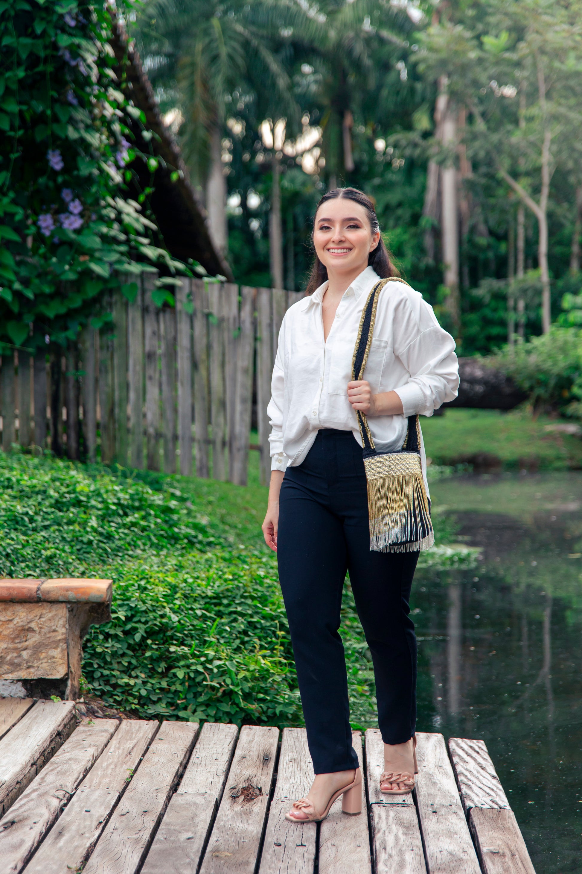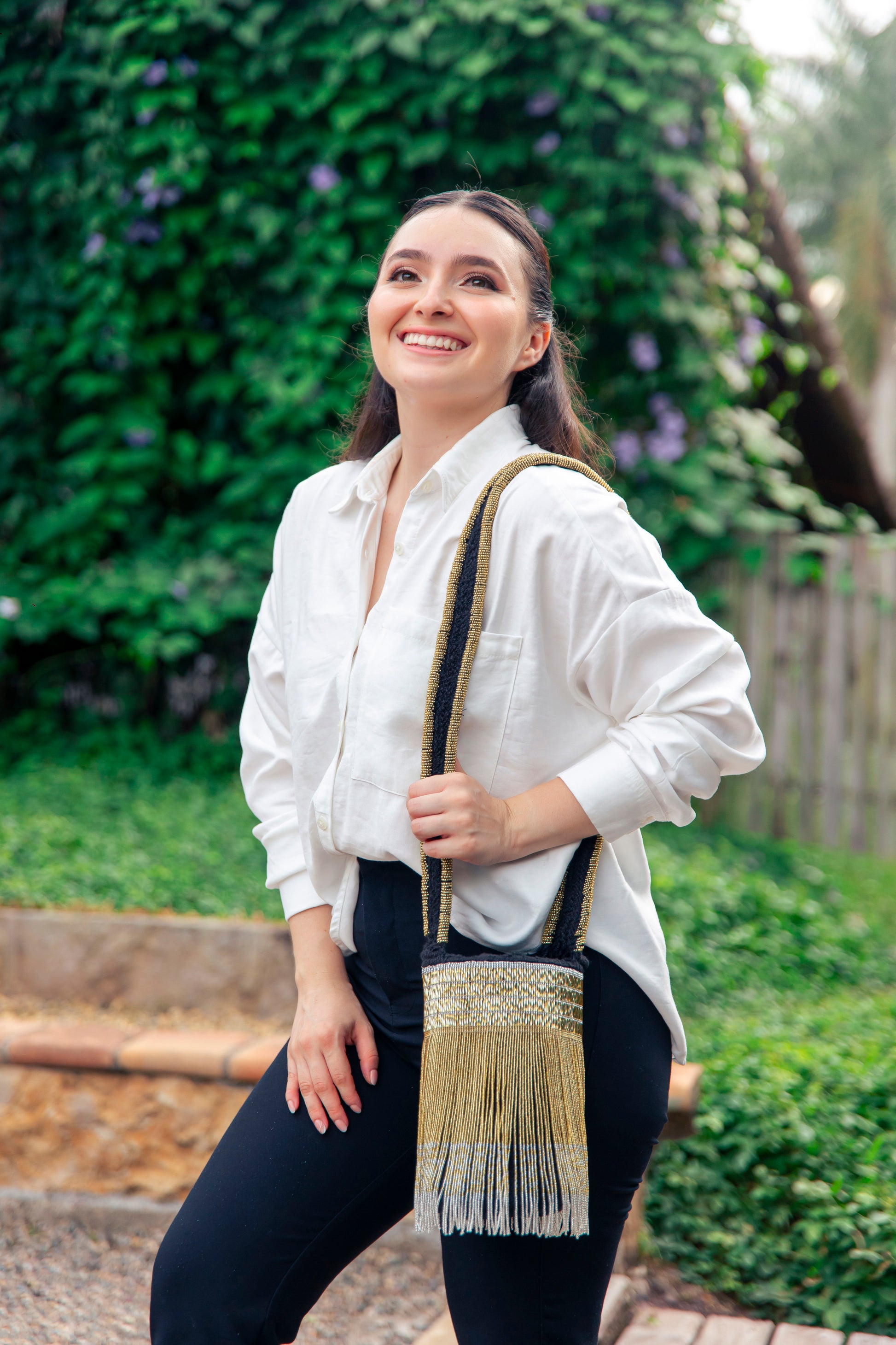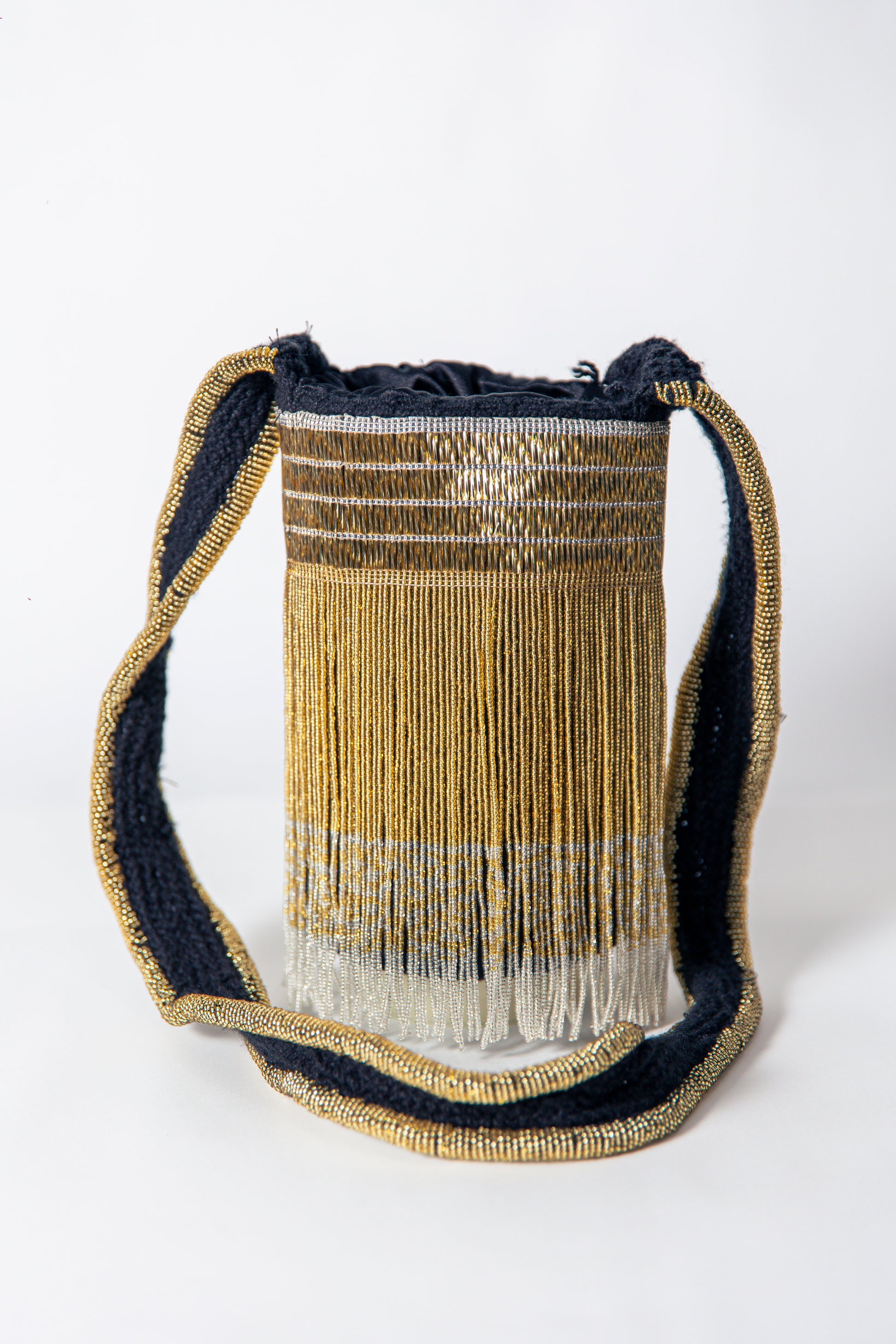 Handwoven from soft alpaca wool and exquisitely adorned with gold and silver glass beads, this luxurious piece reflects the artistry of Colombian indigenous craftsmanship. Its delicate vertical beaded fringe creates a graceful movement, while the matching strap adds a touch of sophistication.