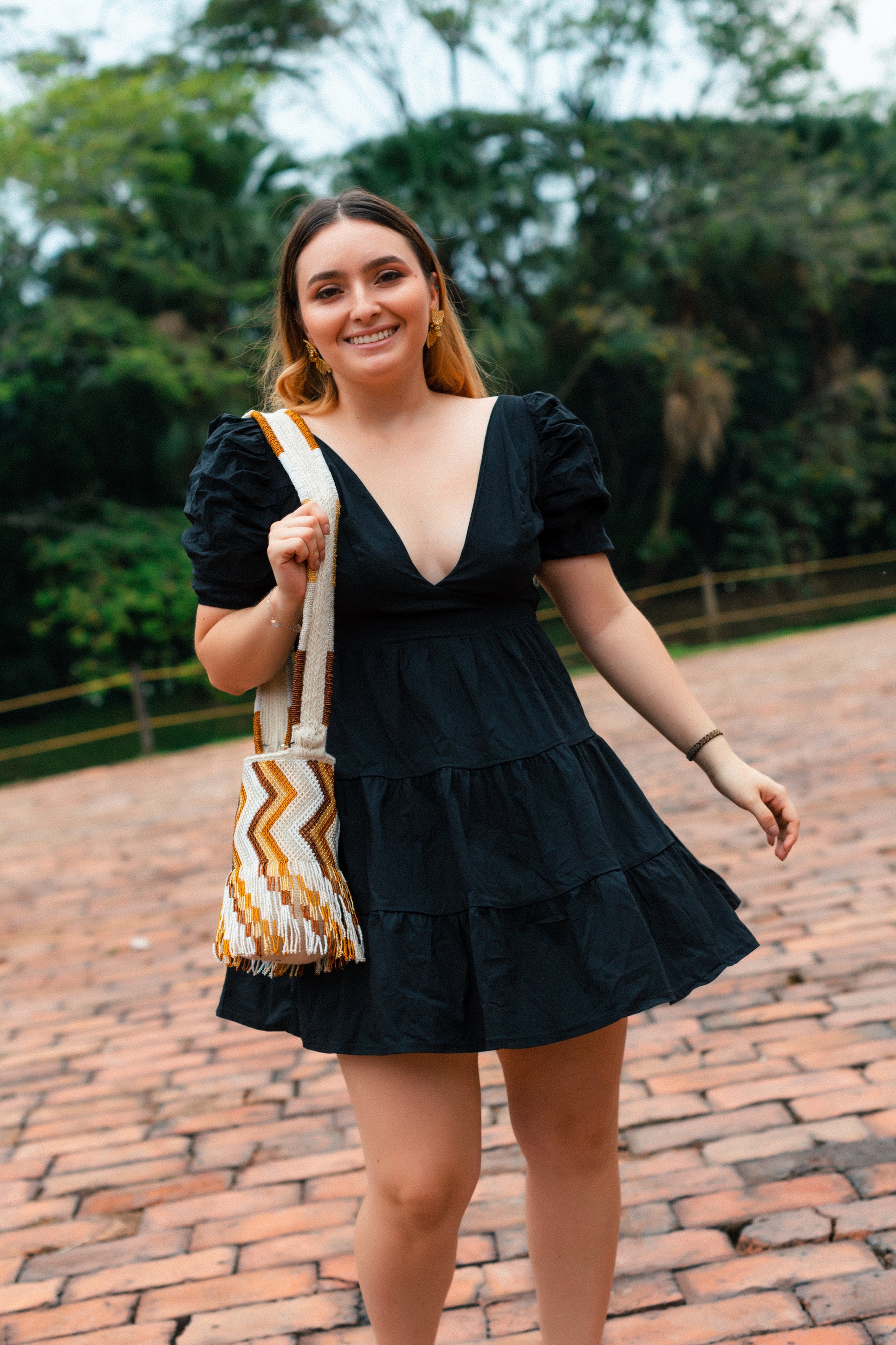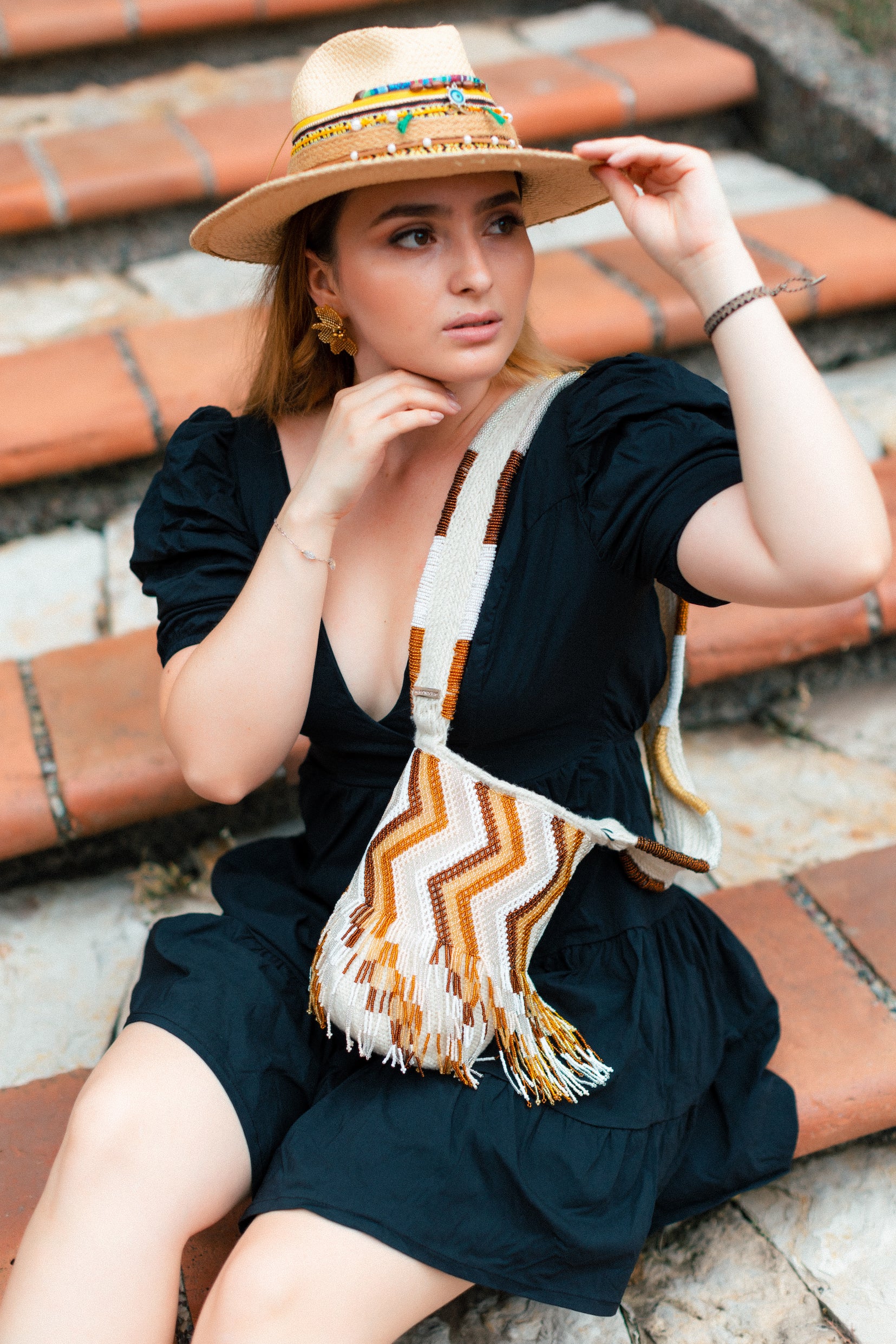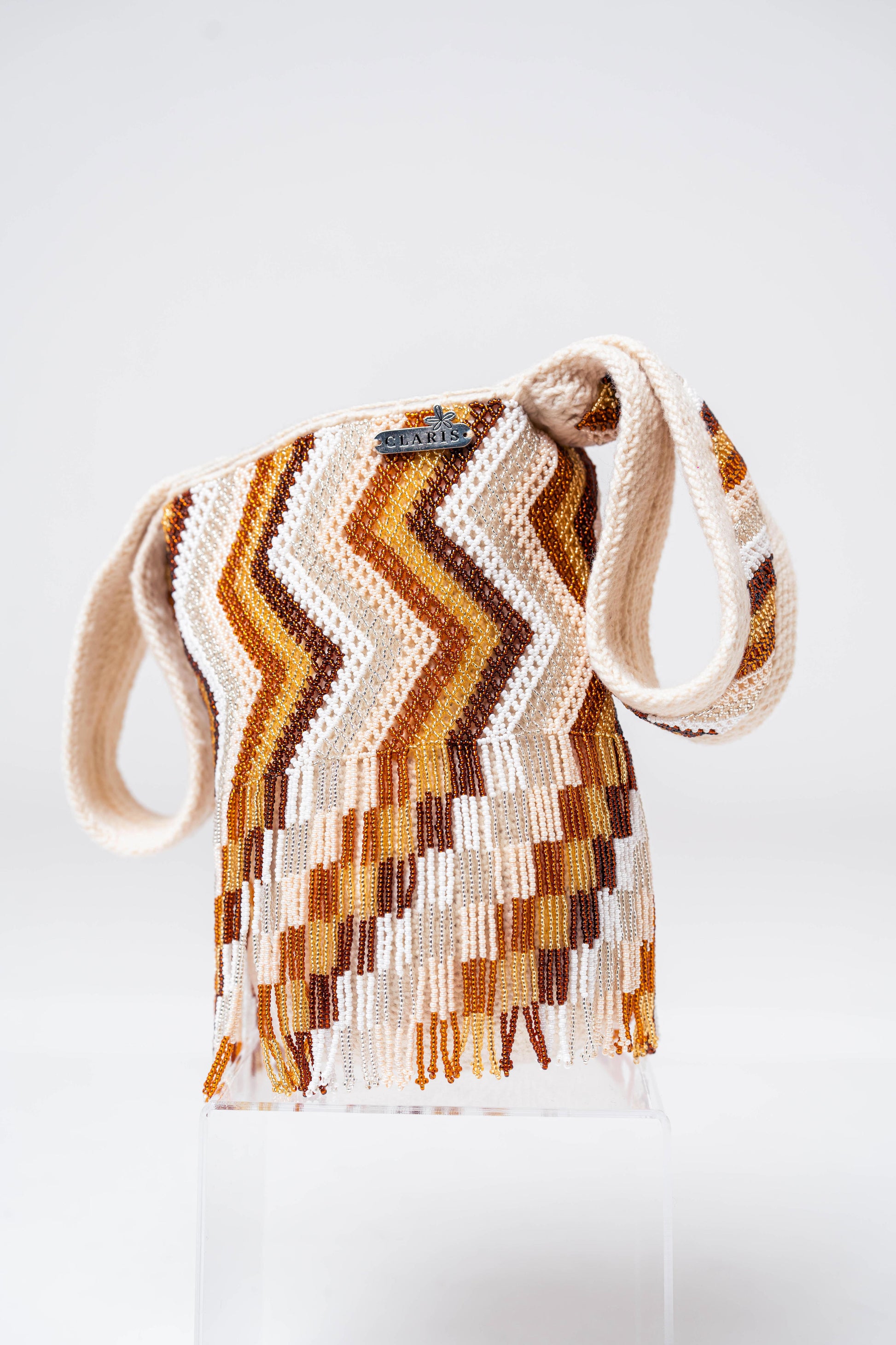 We present the exquisite elegance of the Kankuama bag. Crafted from alpaca wool and meticulously adorned with beads ranging from light to dark brown, passing through white, transparent, and mustard yellow, this bag exudes a vibrant and sophisticated style. Its dimensions are 8.2 inches in height and 7.8 inches in width.