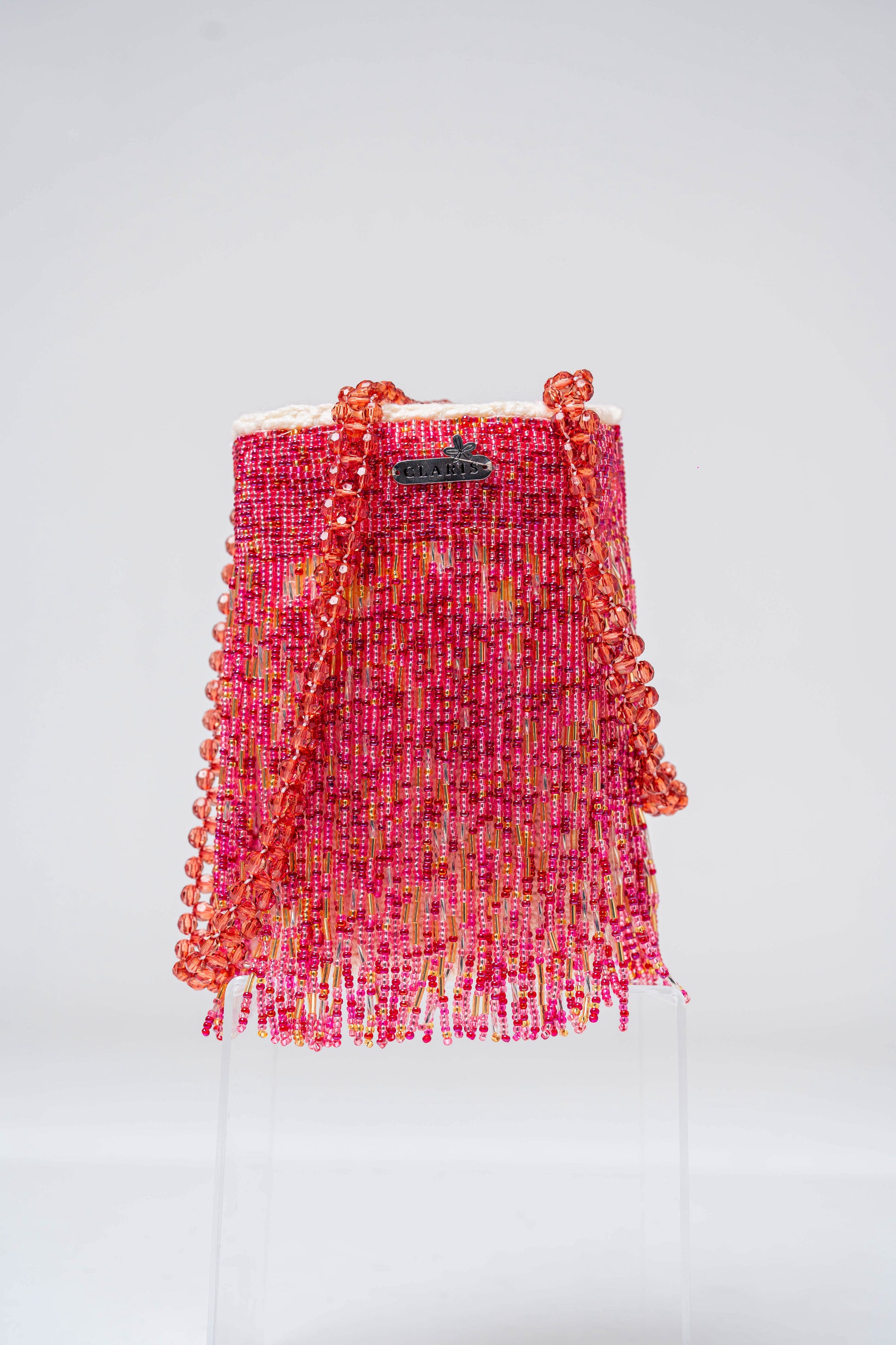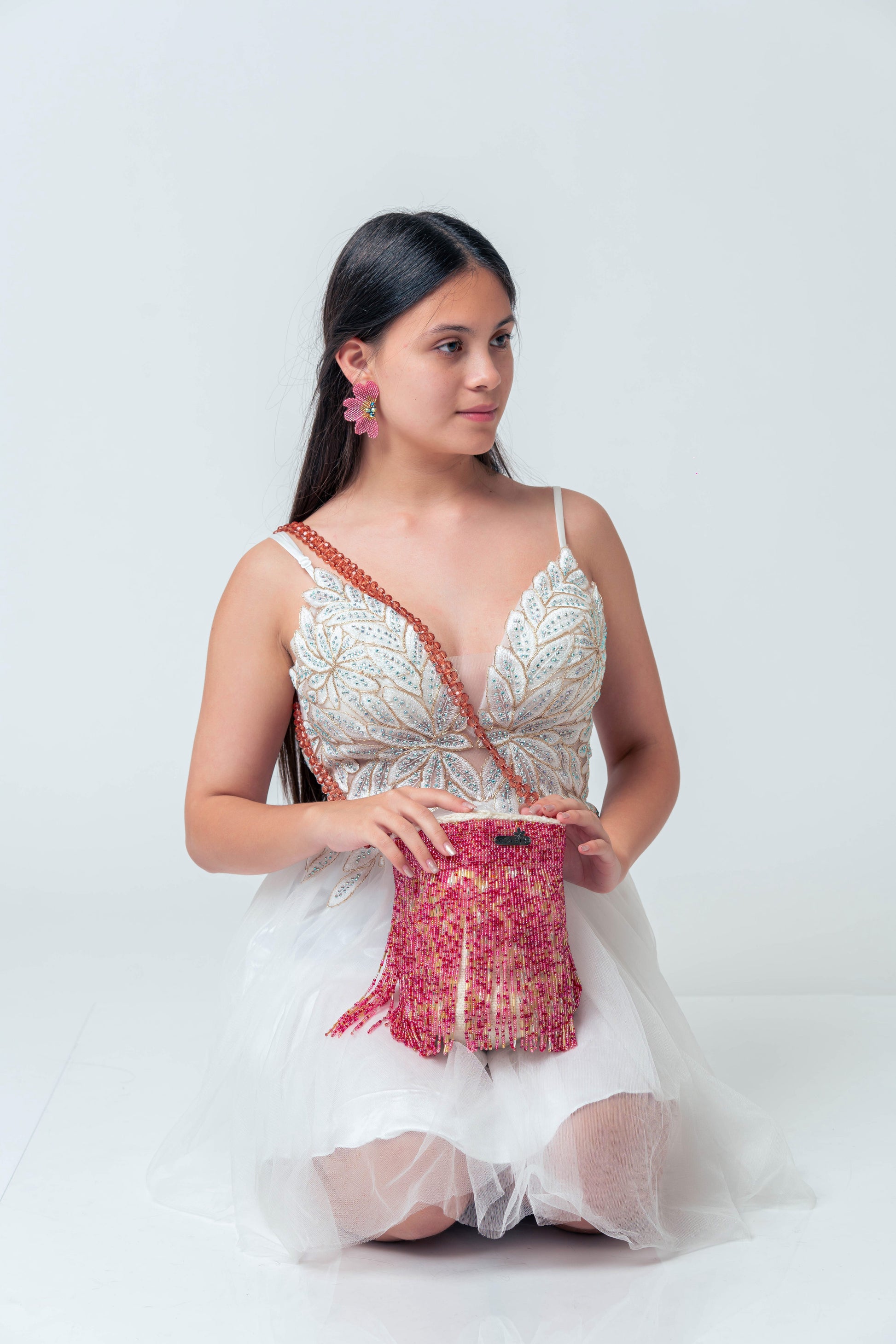 Is a unique handcrafted piece, carefully made 100% by hand. Measuring approximately 8.66 inches in length and 7.09 inches in width, it is woven with high-quality alpaca wool. Adorned with Czech beads in vibrant shades of pink, gold, and purple, the colorful fringes create a dynamic and elegant visual effect, reminiscent of the warm colors of a sunset. This accessory is perfect for any occasion, adding a touch of glamour and sophistication to any outfit.