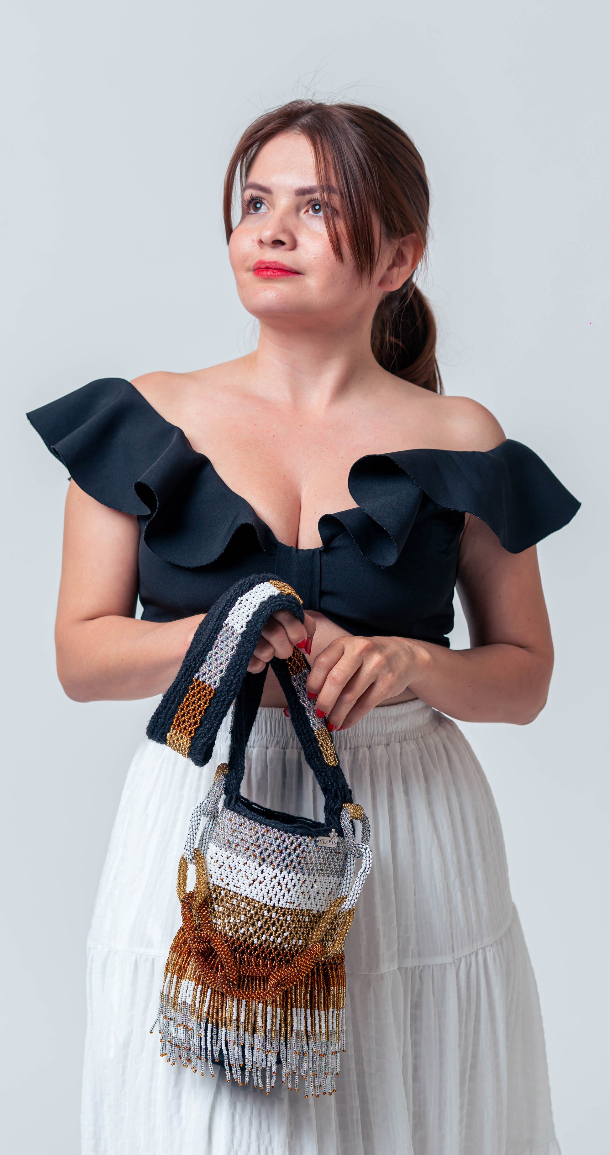 The Kankuama bag, crafted from entirely black alpaca wool, is adorned with multicolored beads in bronze, gold, white, and transparent hues. It offers versatile carrying options with a short, bead-crafted chain-like strap and a long embroidered strap, both decorated with beads. The bag measures 8.2 inches in height and 7.8 inches in width.