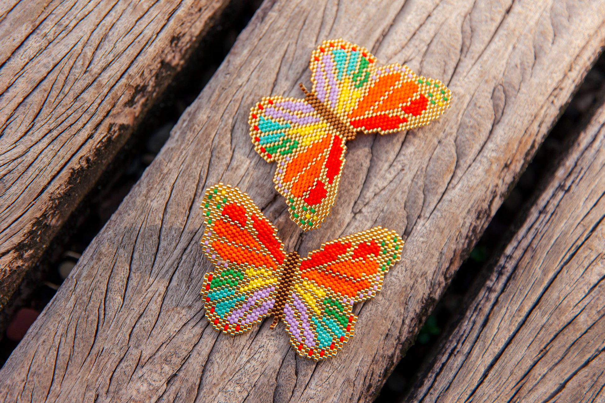Lovely butterflies, entirely handmade, with Miyuki beads in a range of vibrant colors such as mint green, gold, intense red, orange, copper, yellow, and lilac. Each earring, lightweight and elegant, weighs approximately 6.34 grams. Add a touch of beauty and sophistication to your style with these captivating accessories.